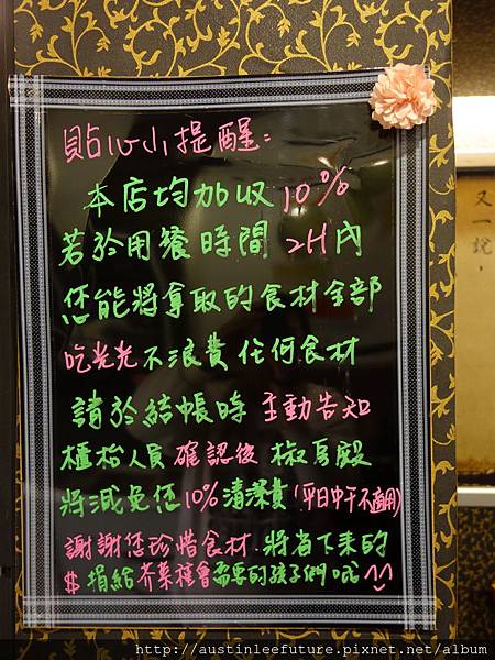 用餐時間限兩小時,原則上加收1成清潔服務費,但晚餐或假日時段若是把取用的食材吃完則可減收清潔服務費,這個規定在過去沒有