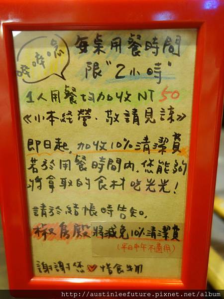 服務人員也有提到,超時的話也無法減收清潔服務費,其實在訂位時店家也提醒請準時,因為後續都有接續的客人要用餐
