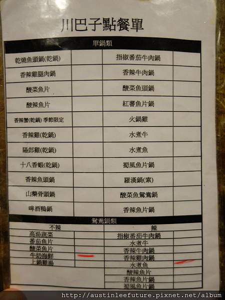 單鍋類,或是鴛鴦類,基本上一個鍋就對了,人數少於五人就只能點一個鍋,所以我都是選鴛鴦鍋,過去吃過酸菜魚片、一般麻辣鍋,但根據新的菜單來看,店家已經不提供一般麻辣鍋了,所以這次選了水煮魚片與牛奶海鮮鍋