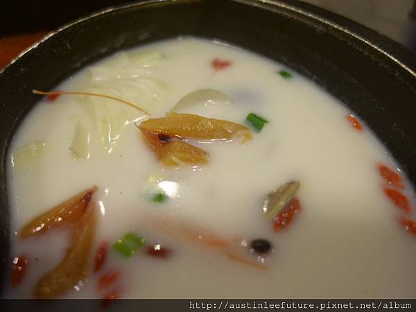 牛奶海鮮鍋的部分,建議一上桌就先喝湯,因為煮久了會變淡,似乎是牛奶加熱後凝固會跟浮渣黏在一起,所以撈掉浮渣後牛奶味也是會變淡,加上煮蔬菜海鮮也會出水吧,所以建議剛上桌就先喝湯看看囉