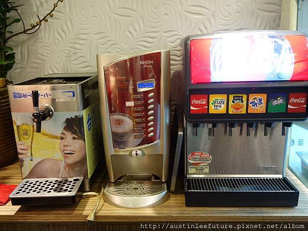 汽水飲料,熱飲機,以及台灣啤酒(在台北提供啤酒暢飲的店一般都會貴上一些)