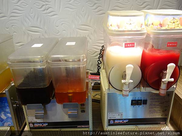 雪泥機以及飲料機,飲料機裡還有提供烏梅汁(黑黑的那個)
