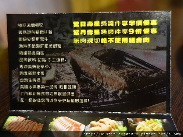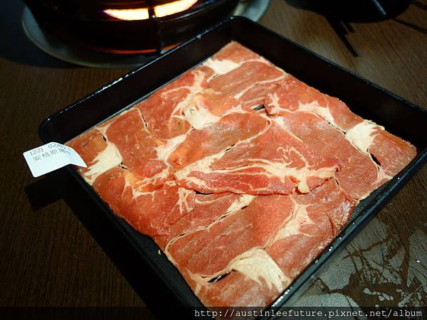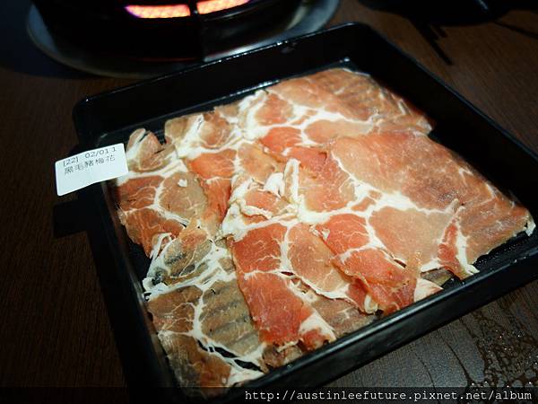 左上角的是肉品及海鮮加點單,用紅色蠟筆在上面畫再交給服務人員即可,第一次當然就全上,包含穀飼小肥牛、安格斯黑牛胸腹肉、紐西蘭沙朗、台灣黑毛豬梅花、台灣黑毛豬五花