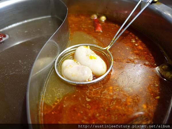 鴨血是自取的,放到麻辣鍋裡煮,鴨血本身很細緻很嫩,就可惜因為那四川麻辣鍋湯頭不怎樣,所以這鴨血吃起來就少了麻辣香氣,或許,直接吃不要再下鍋煮或許風味會更好(在自行取用區那裏本來就已經用麻辣料包在燉煮了)