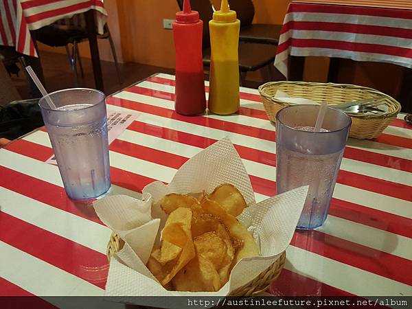 去櫃檯點好餐,就可以拿杯子去裝汽水,汽水是可以免費續杯的,桌上這洋芋片是招待