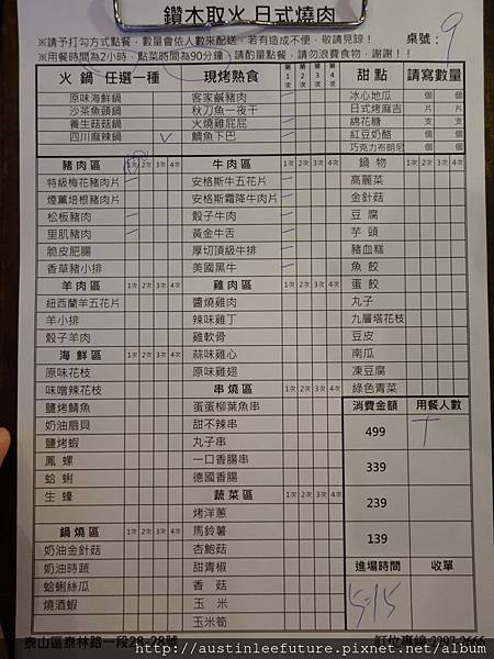 菜單,店員介紹用餐形式及規定,120分鐘用餐期間,90分鐘到時會先最後加點並收菜單,火鍋加燒肉的用餐形式,菜單上的都能點,大家可以看到進場時間是晚間5:15 (因為之前塞車耽誤了一下),菜式還算多樣,尤其是現烤熟食類在其他燒肉店的確不多見,味道如何等等說明