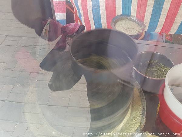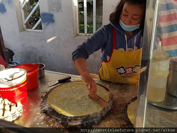 這一家的煎餅是使用純綠豆麵,也就是綠豆磨出來的麵漿,