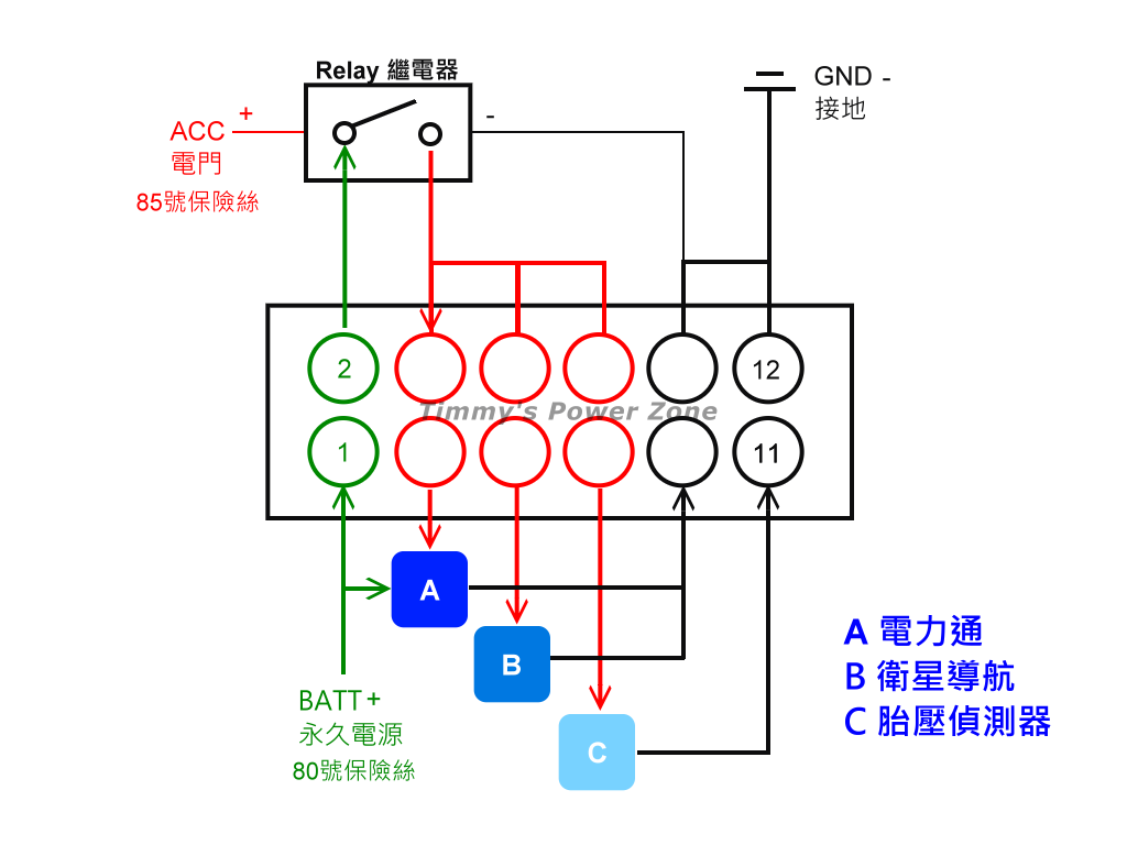 85號保險絲的啟動電源(車輛啟動時供電)驅動Relay,經過Relay出來的電再進入4號端子,同時並聯給6、8號端子,分別供電給3.5.7端子做輸出。如此一來3~7號就都是啟動電源了。(以紅色表示)。未來如果有要加裝其他項目,就從3~7拉出電源即可。