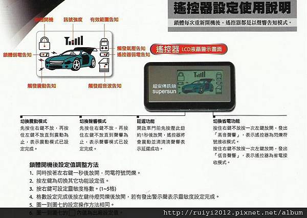 上/下車延遲警戒時間(可達150秒)、電池弱電警告聲間隔時間、發報告知時間、閃燈接收模式